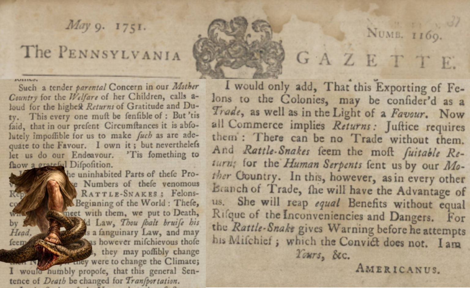 Бенджамин Франклин, один из отцов-основателей Соединённых Штатов Америки, взирающий на нас со стодолларовой банкноты, ядовито сетовал под псевдонимом Americanus в The Pennsylvania Gazette 9 мая 1751 года на практику ввоза осуждённых из Великобритании: