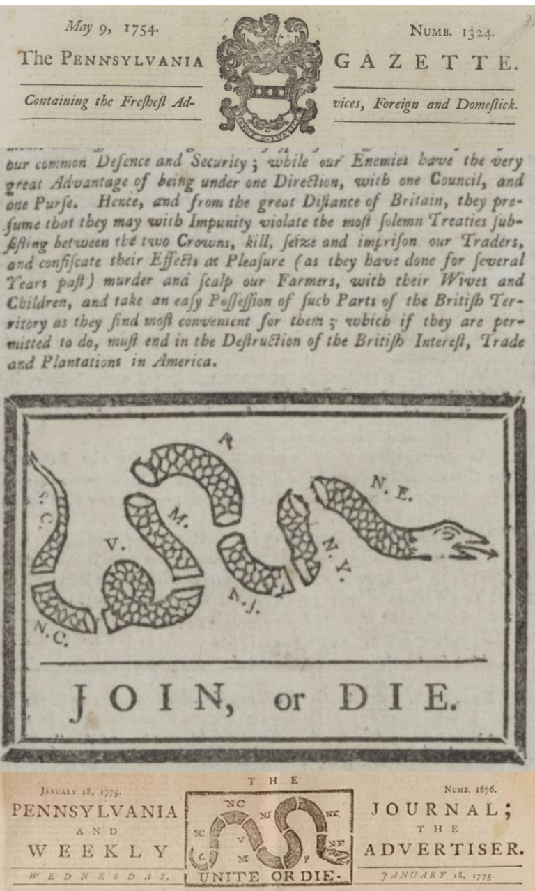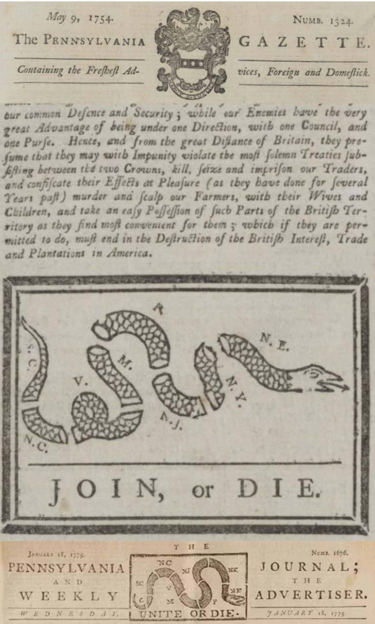 9 мая 1754 года в газете Бенджамина Франклина The Pennsylvania Gazette была опубликована статья, призывающая британские колонии на восточном побережье Северной Америки объединиться против угрозы французской агрессии из западных внутренних районов. Этот воодушевляющий призыв был подкреплен сопровождающей иллюстрацией, на которой изображена змея, разрезанная на восемь частей, каждая из которых помечена инициалами одной из тринадцати американских колоний. Новая Англия была представлена одним сегментом, а не четырьмя колониями, из которых она состояла в то время (Коннектикут, Массачусетс, Нью-Гэмпшир и Род-Айленд). Делавэр, входивший в то время в состав Пенсильвании, не был указан отдельно, а Джорджия была полностью опущена. В результате на картинке изображено восемь сегментов змеи, а не традиционные тринадцать колоний. В первом варианте воодушевляющим слоганом было “Присоедини(те)сь, или умри(те)” [Join, or Die], который позже сменился на более дипломатичное “Объединитесь или умрите” [Unite or Die].