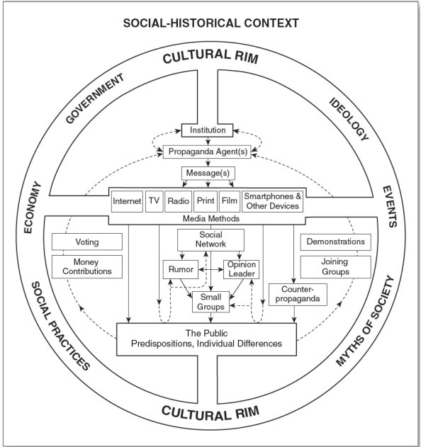 Пропаганда в широком смысле включает в себя всё это. В узком смысле она характеризуется институциональным качеством. В пропаганде мы находим методы психологического воздействия в сочетании с методами организации и охвата людей с целью побудить их к действию."